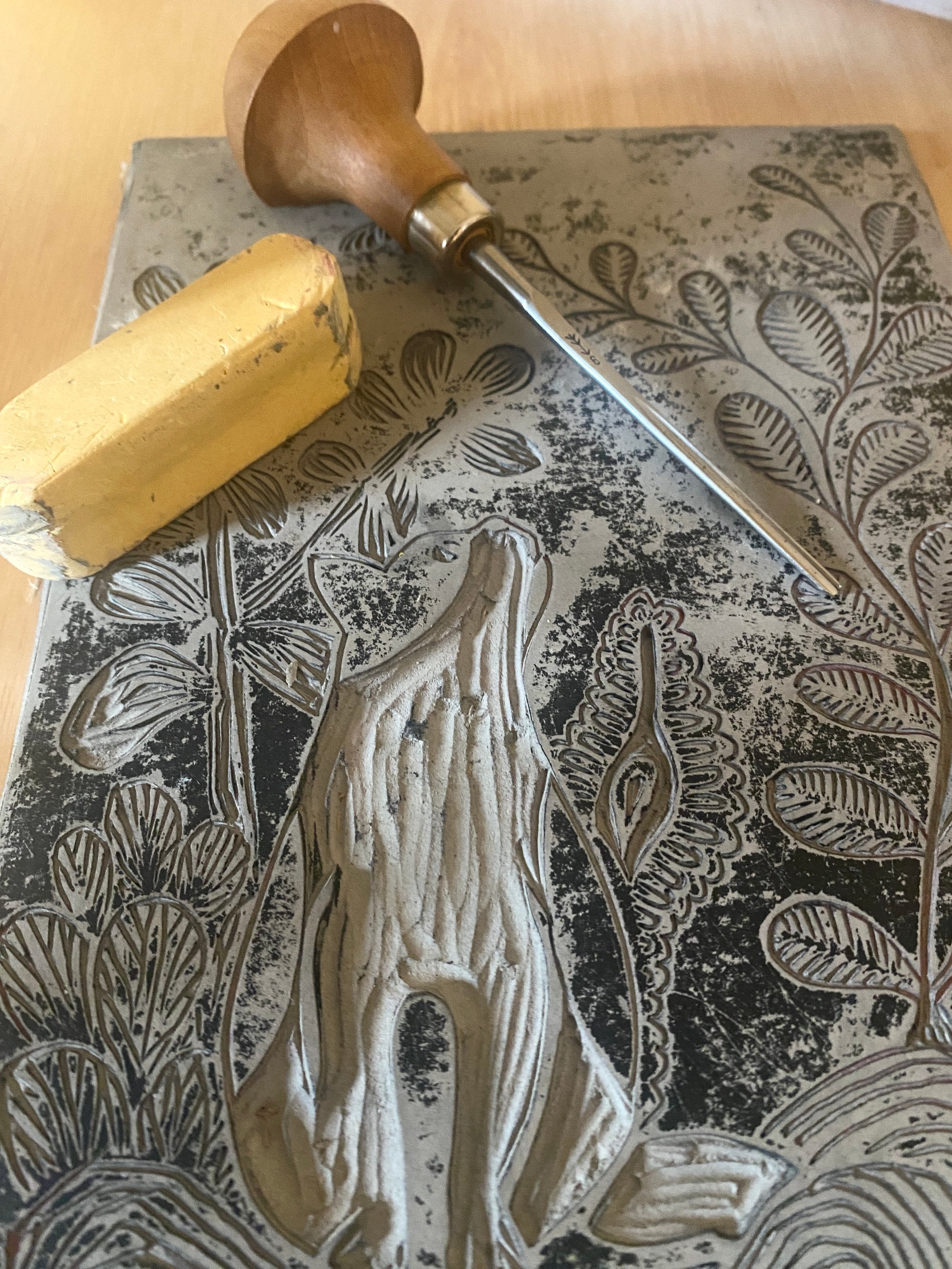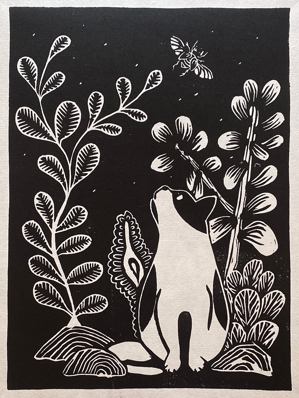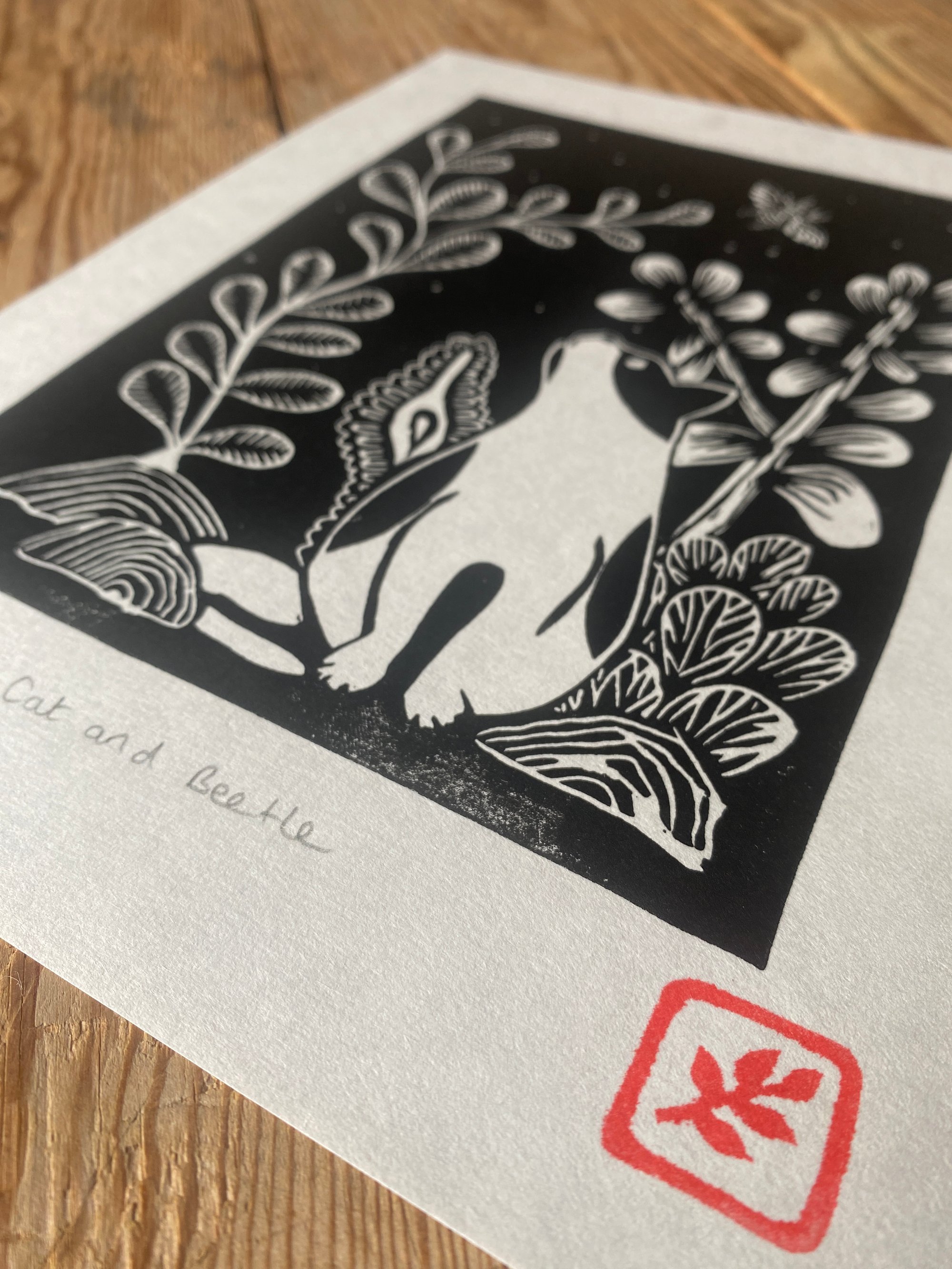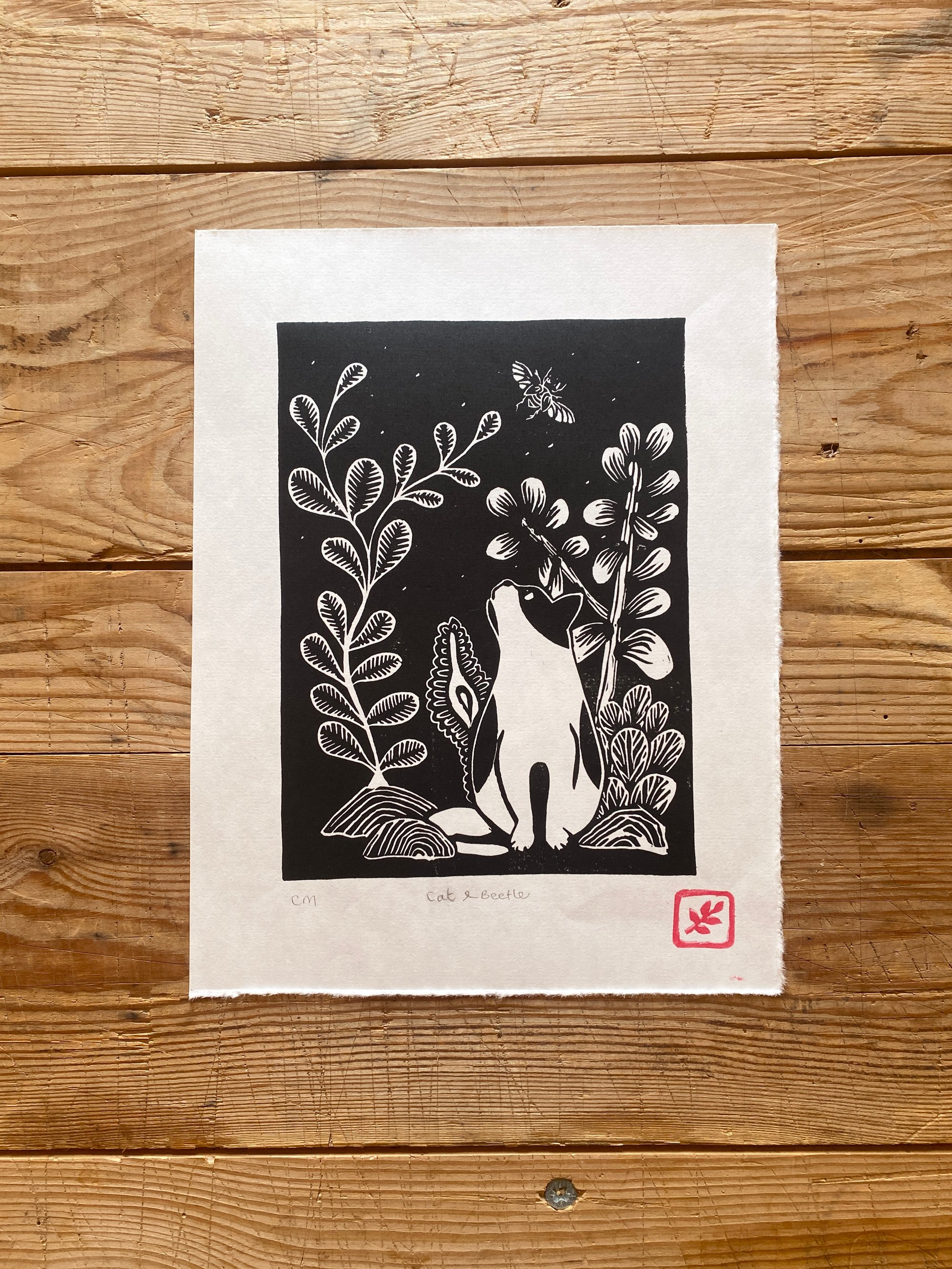 Original lino print, hand printed on traditional Japanese HoSho paper of a cat & beetle.