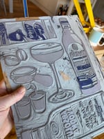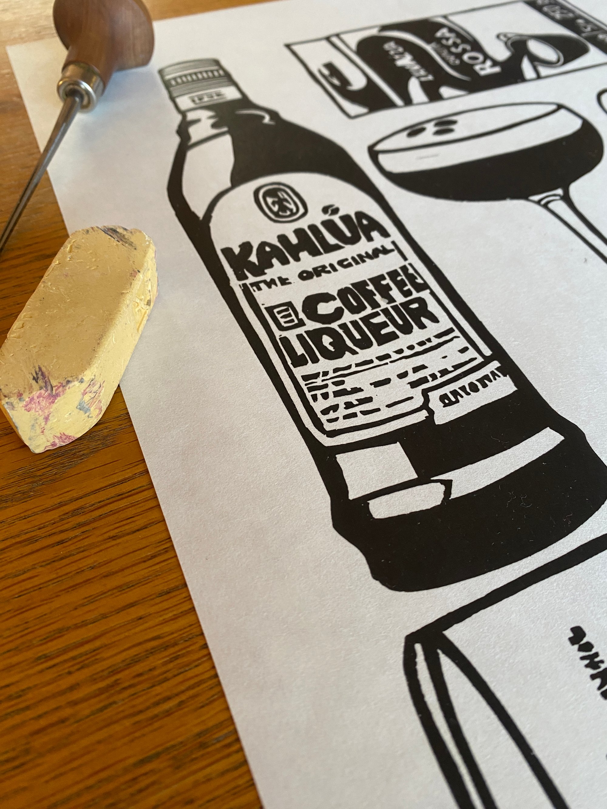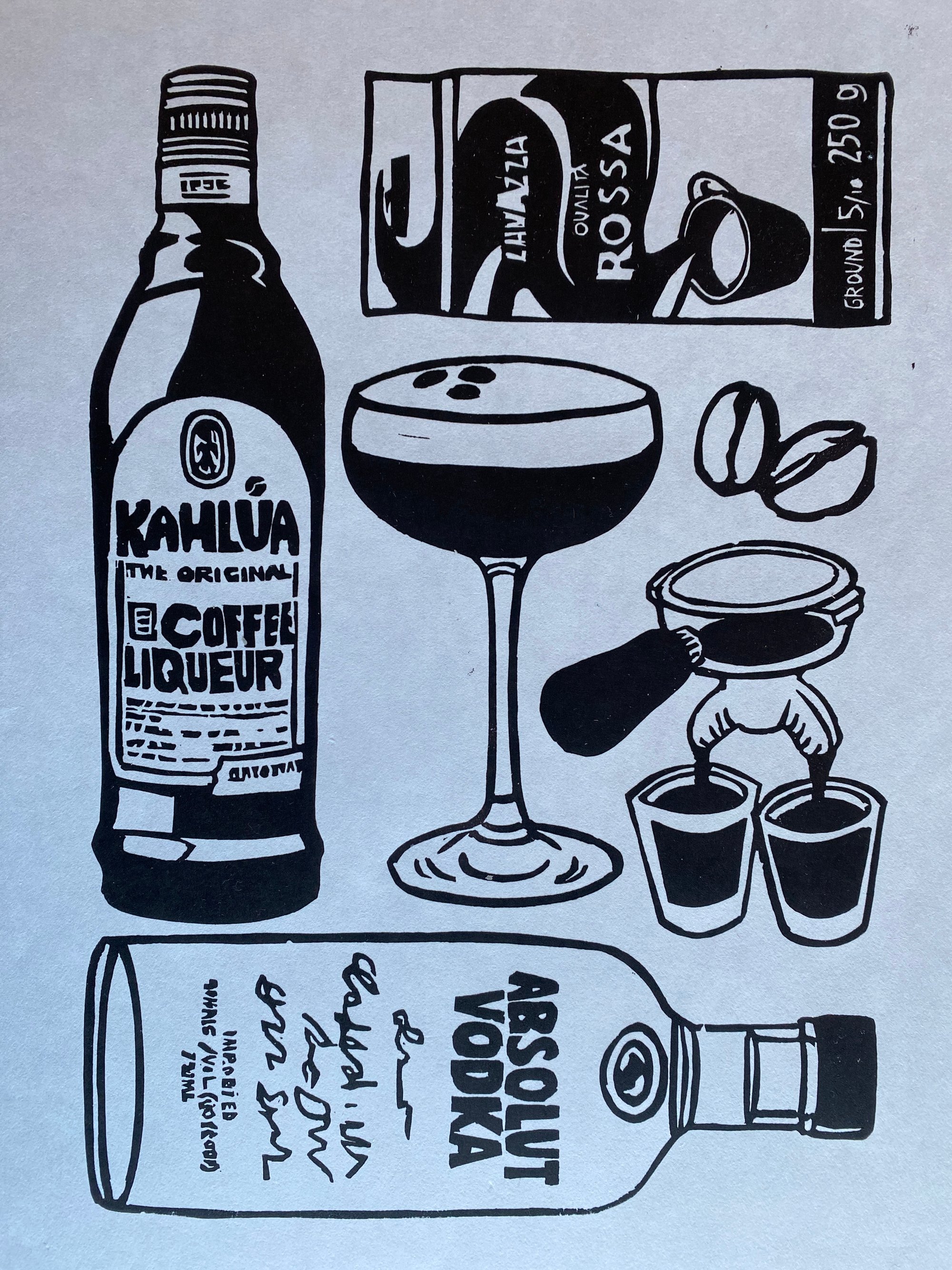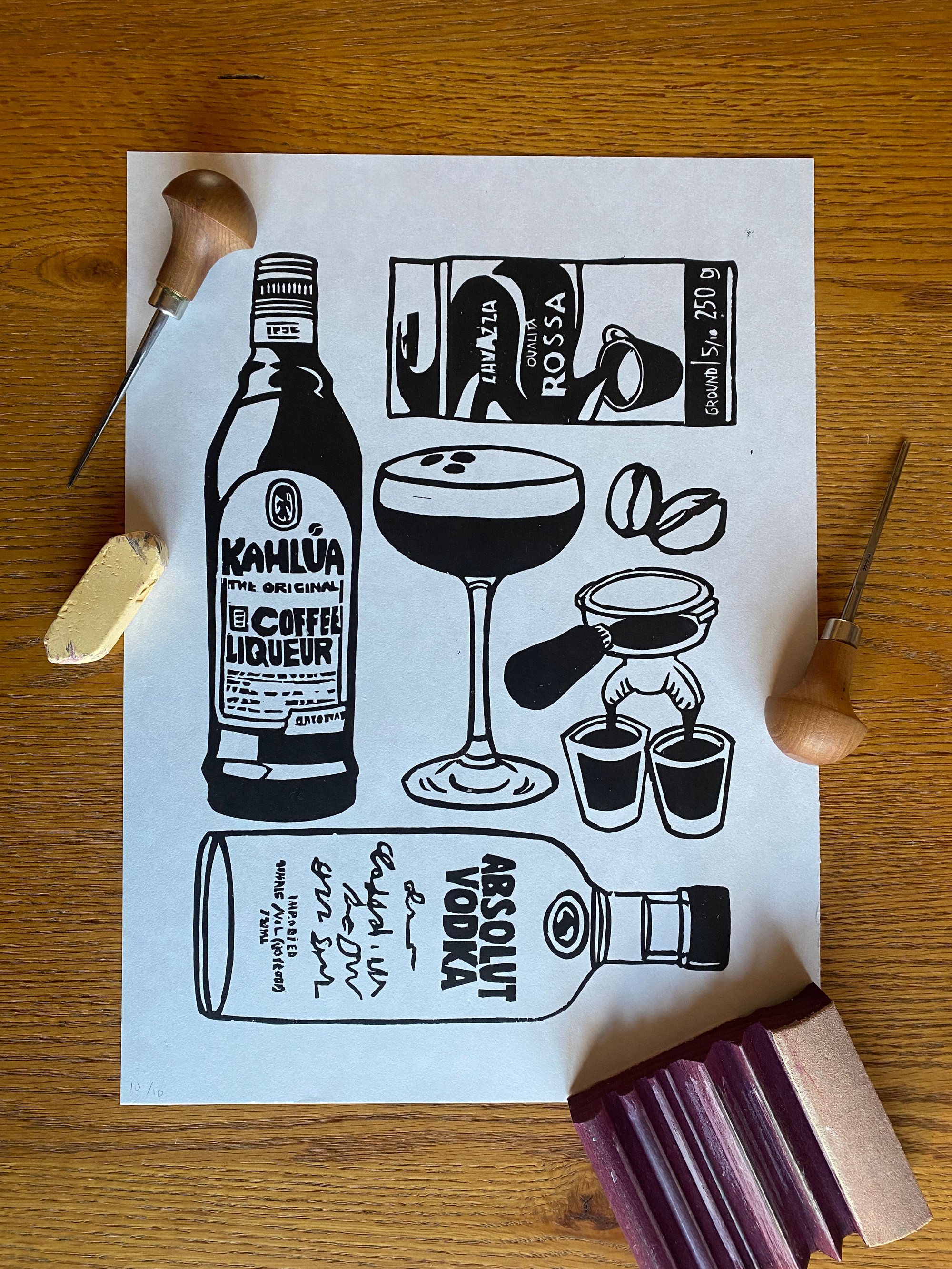 Original lino print, hand printed on traditional Japanese HoSho paper of an original Espresso Martini design