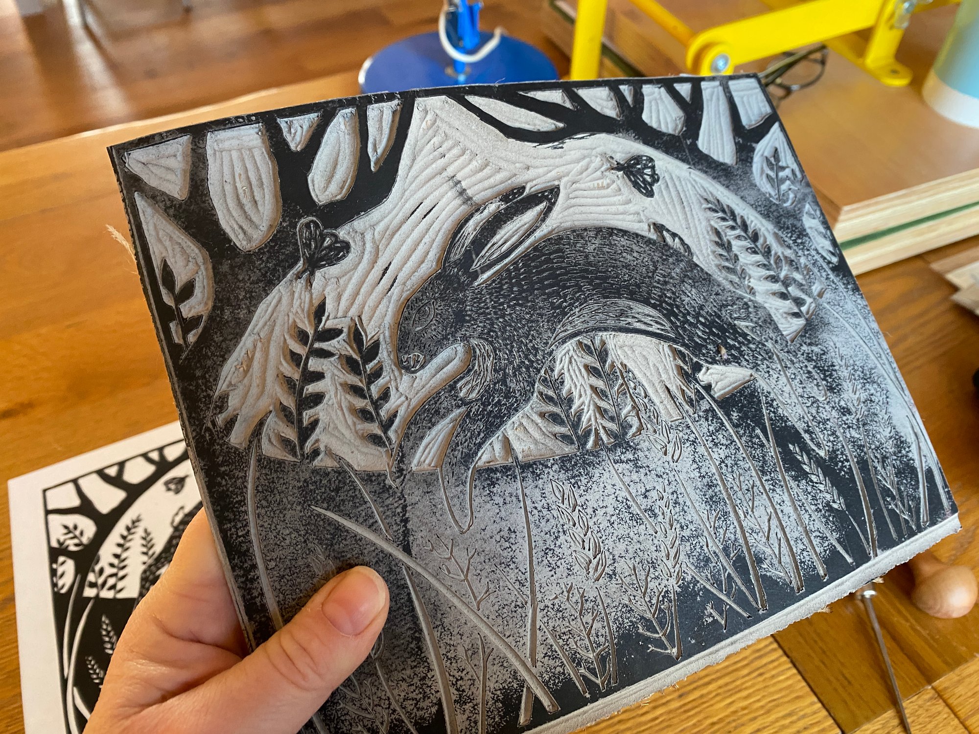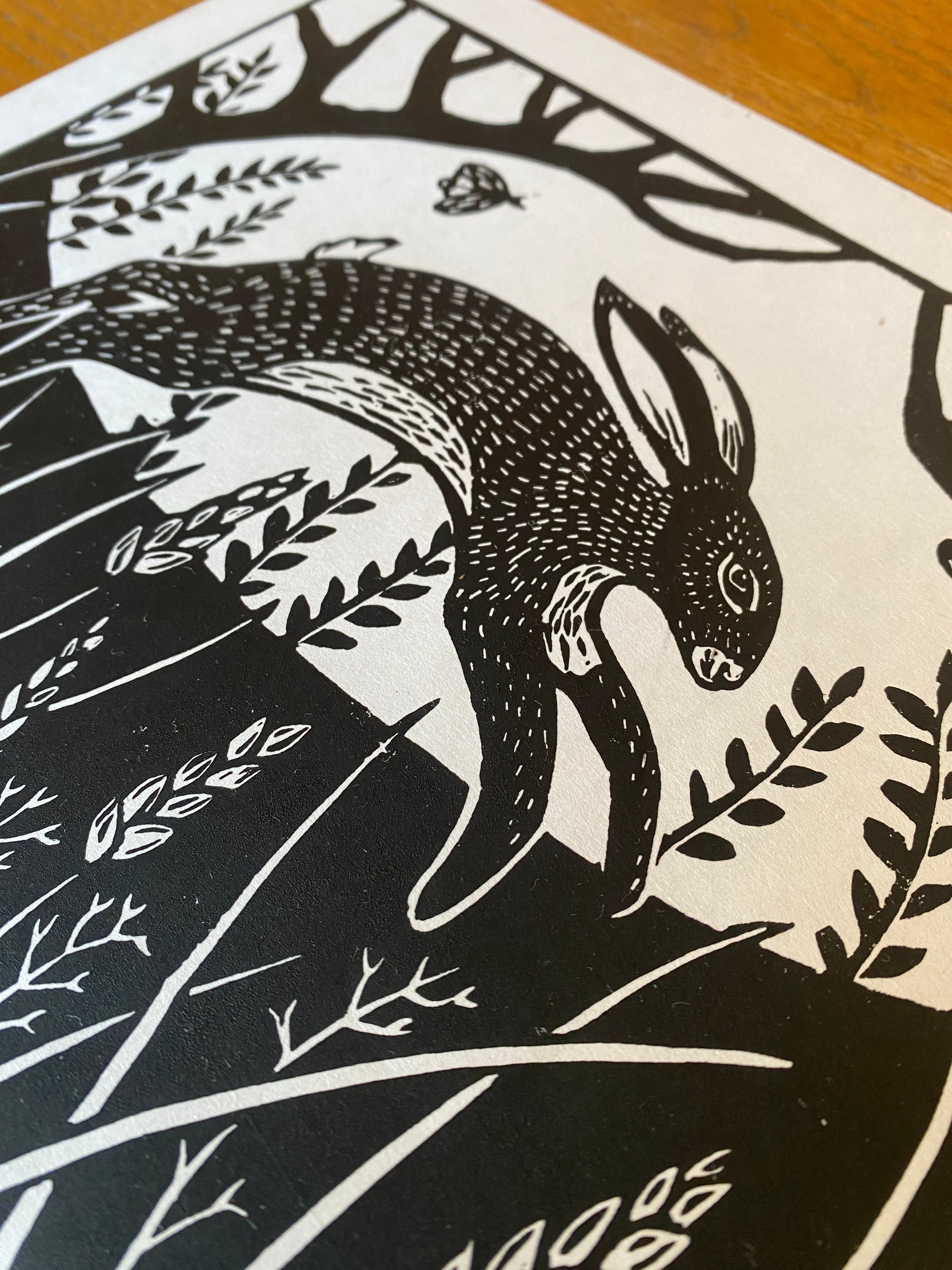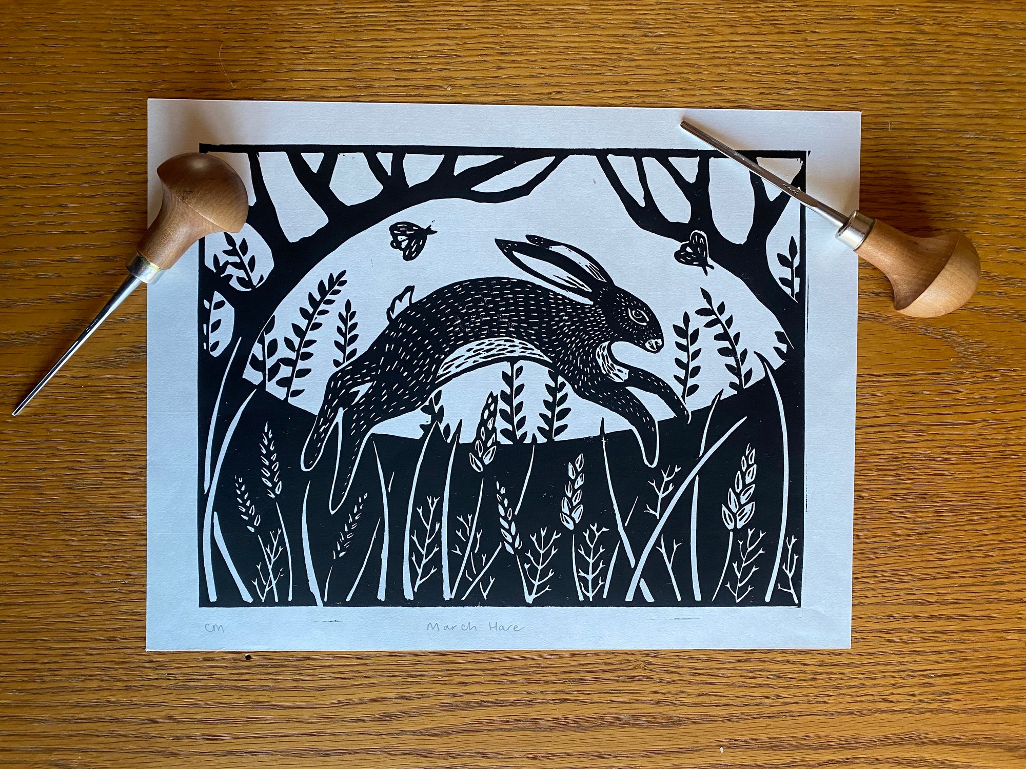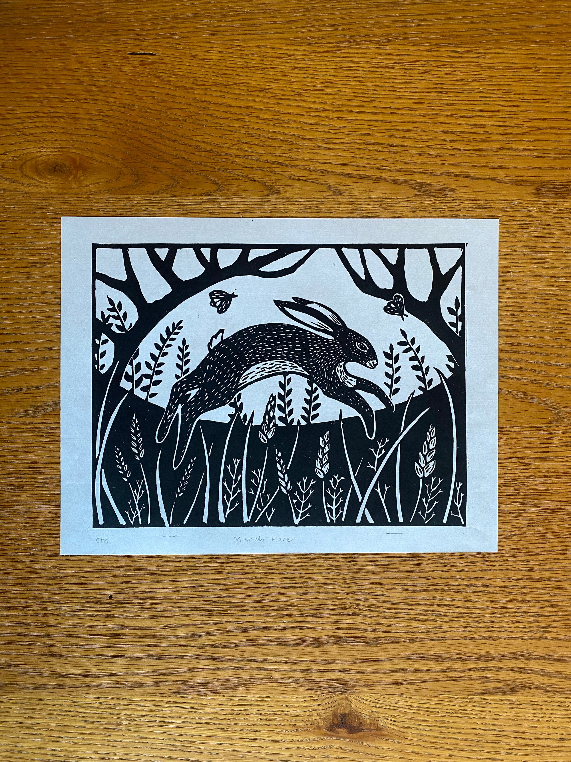 Original lino print, hand printed on traditional Japanese HoSho paper of an original March Hare design