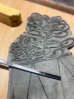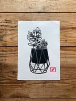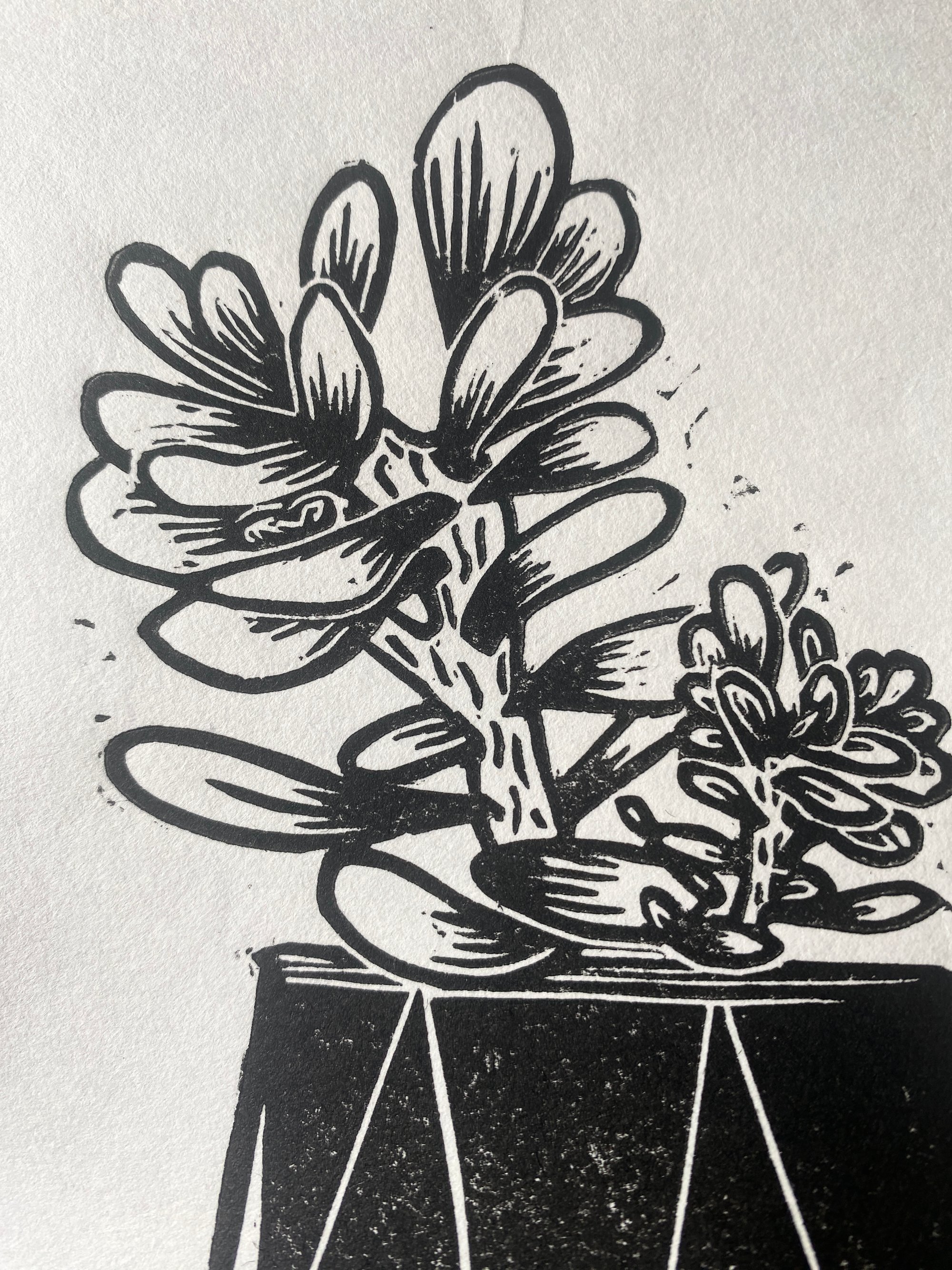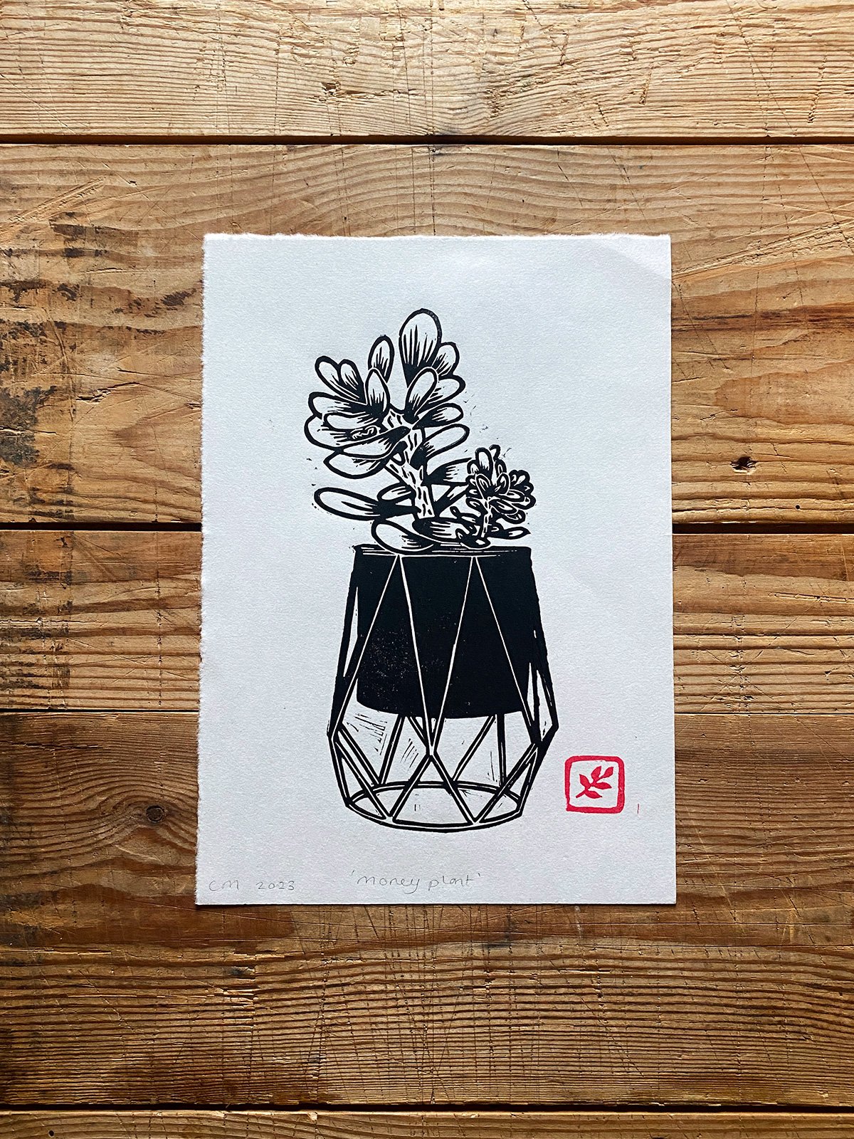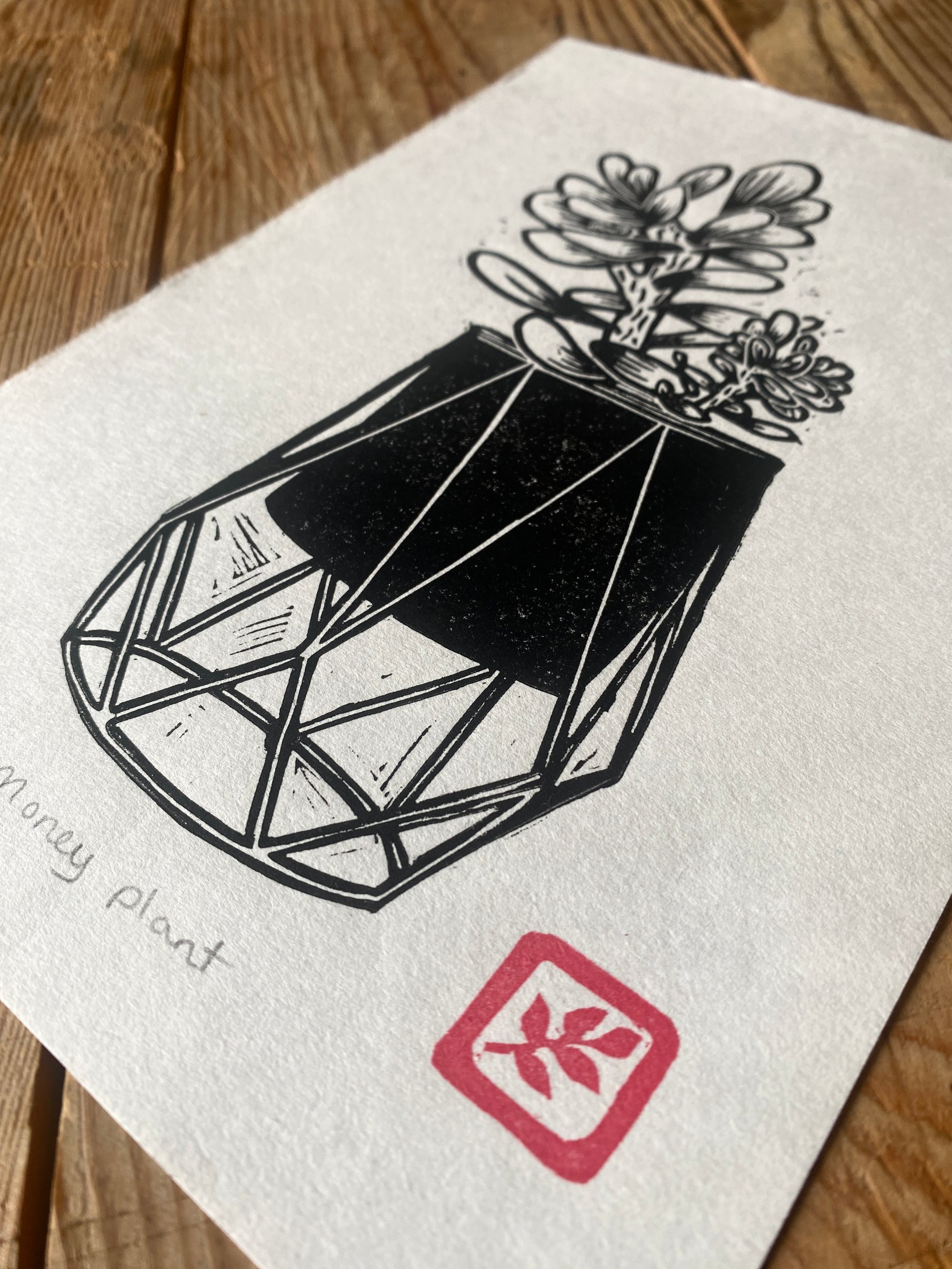 Original lino print, hand printed on traditional Japanese HoSho paper of a Money plant.
