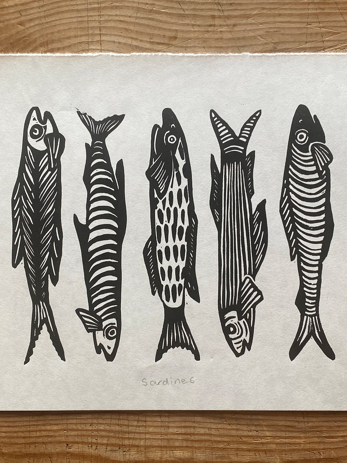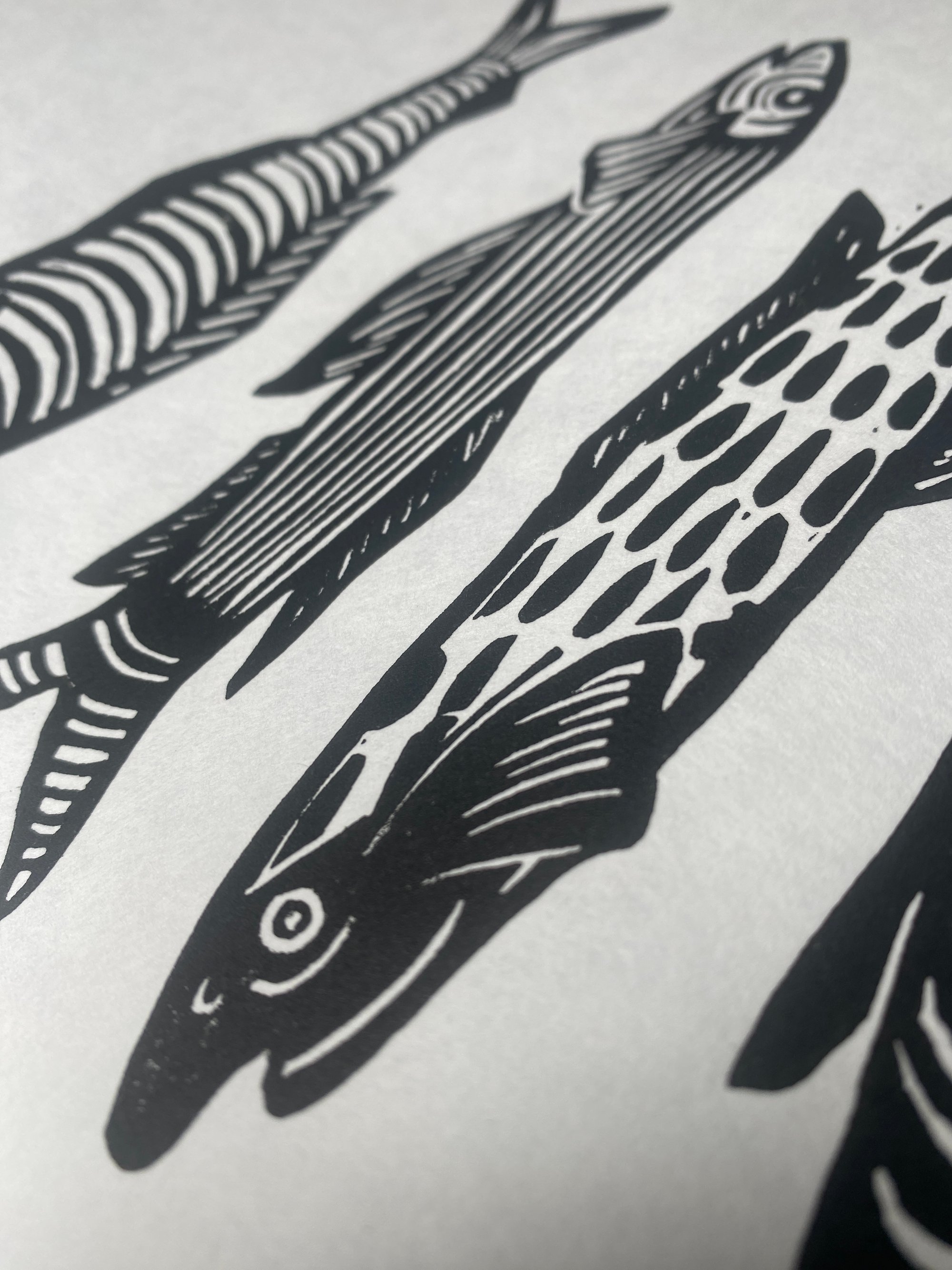 Original lino print, hand printed on traditional Japanese HoSho paper of Sardines.
