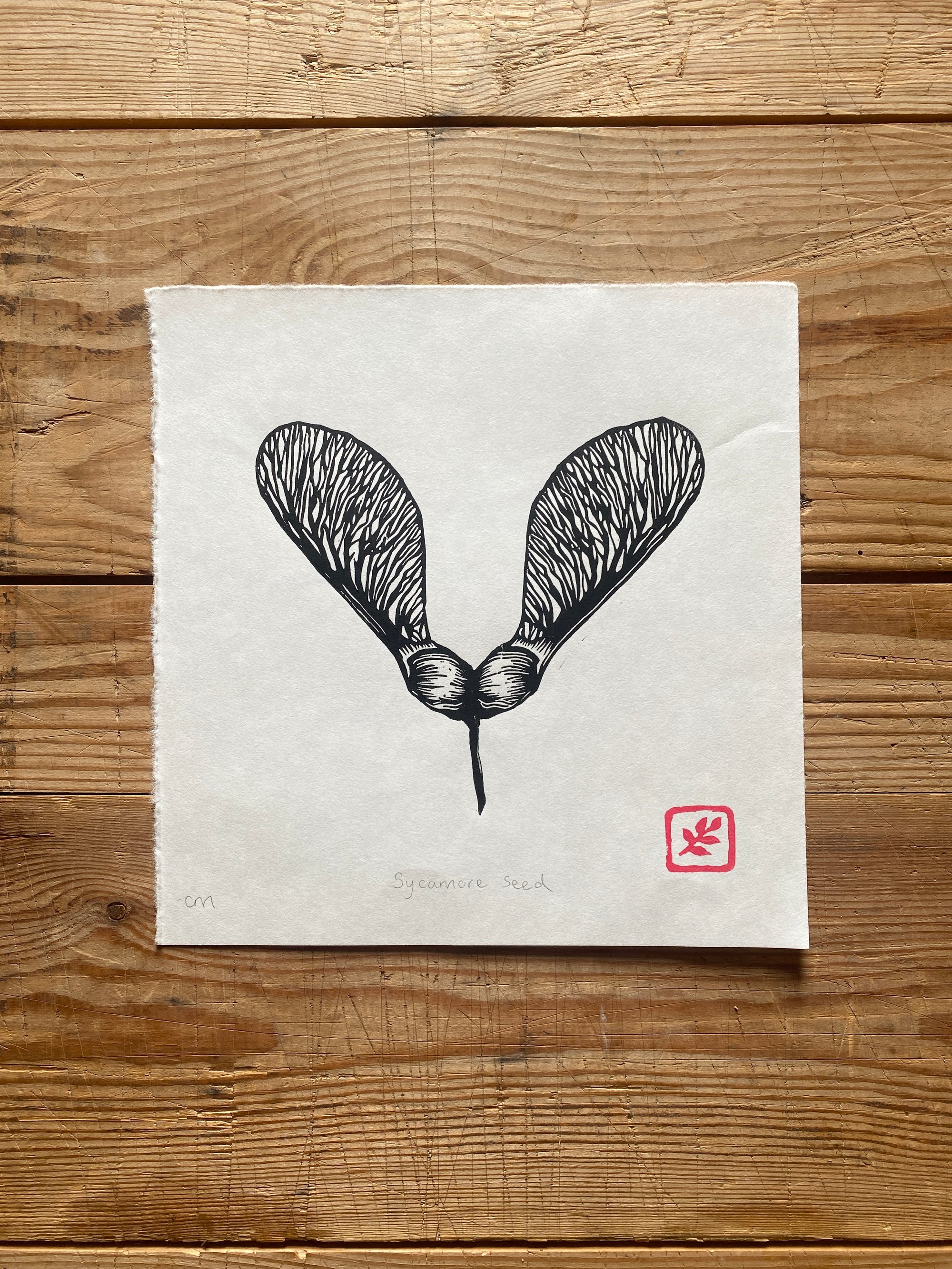 Original lino print, hand printed on traditional Japanese HoSho paper of a Sycamore seed.