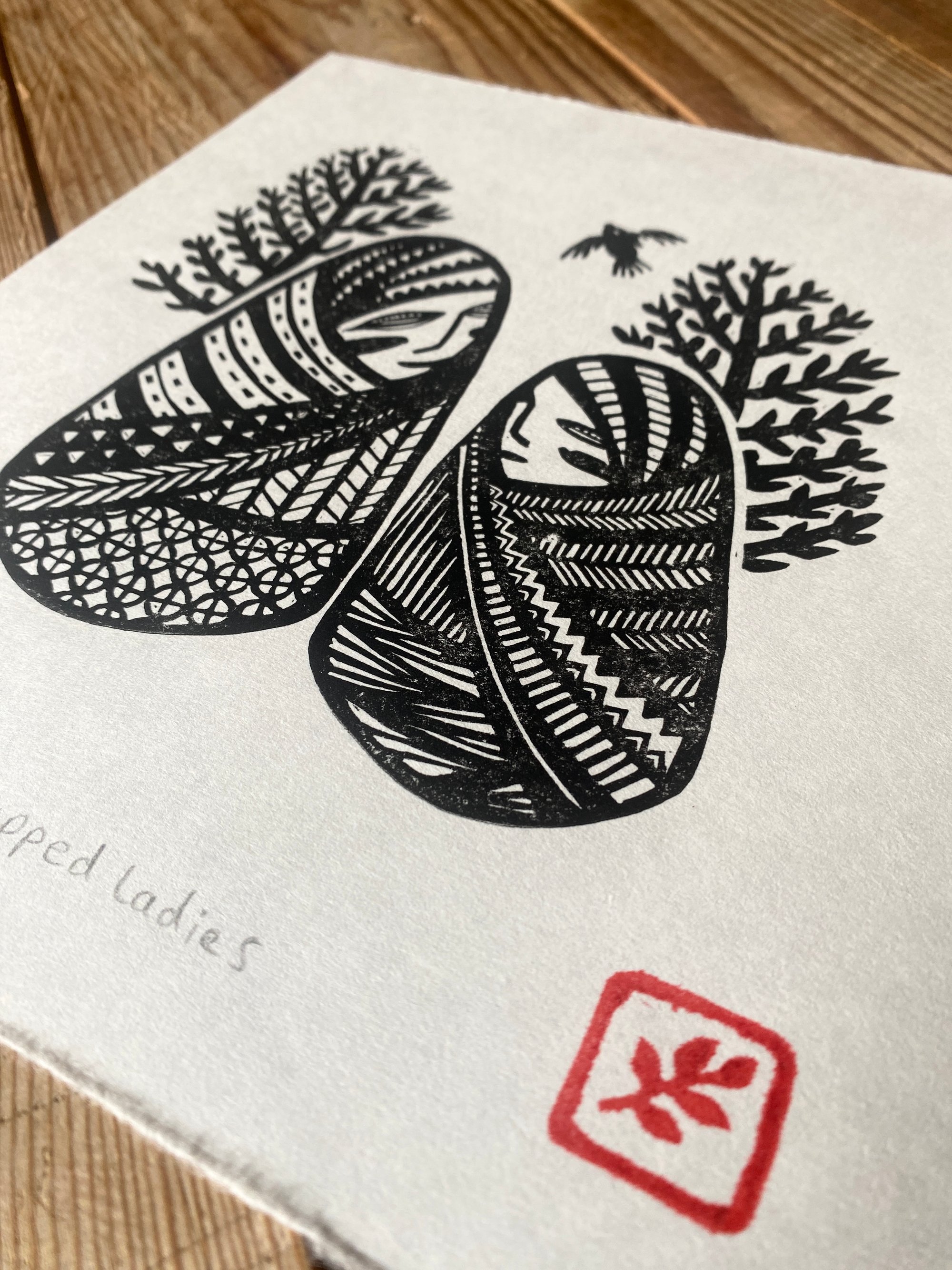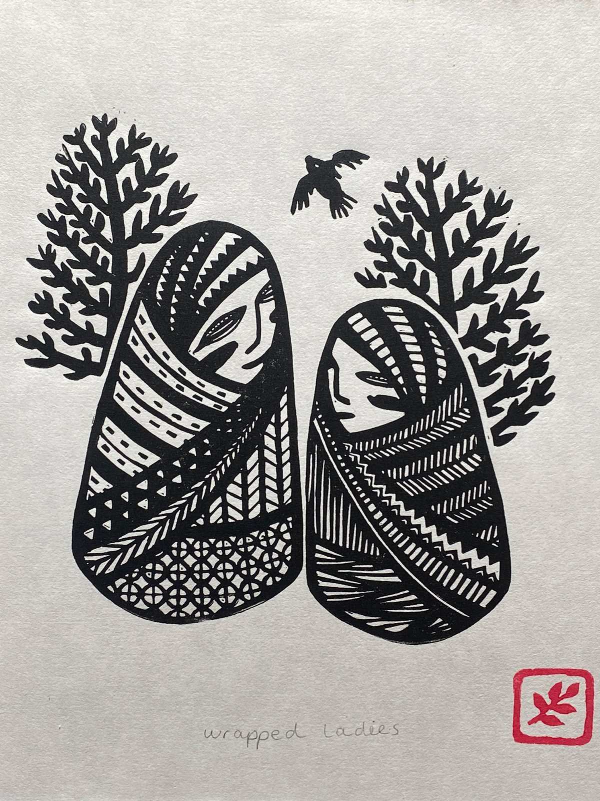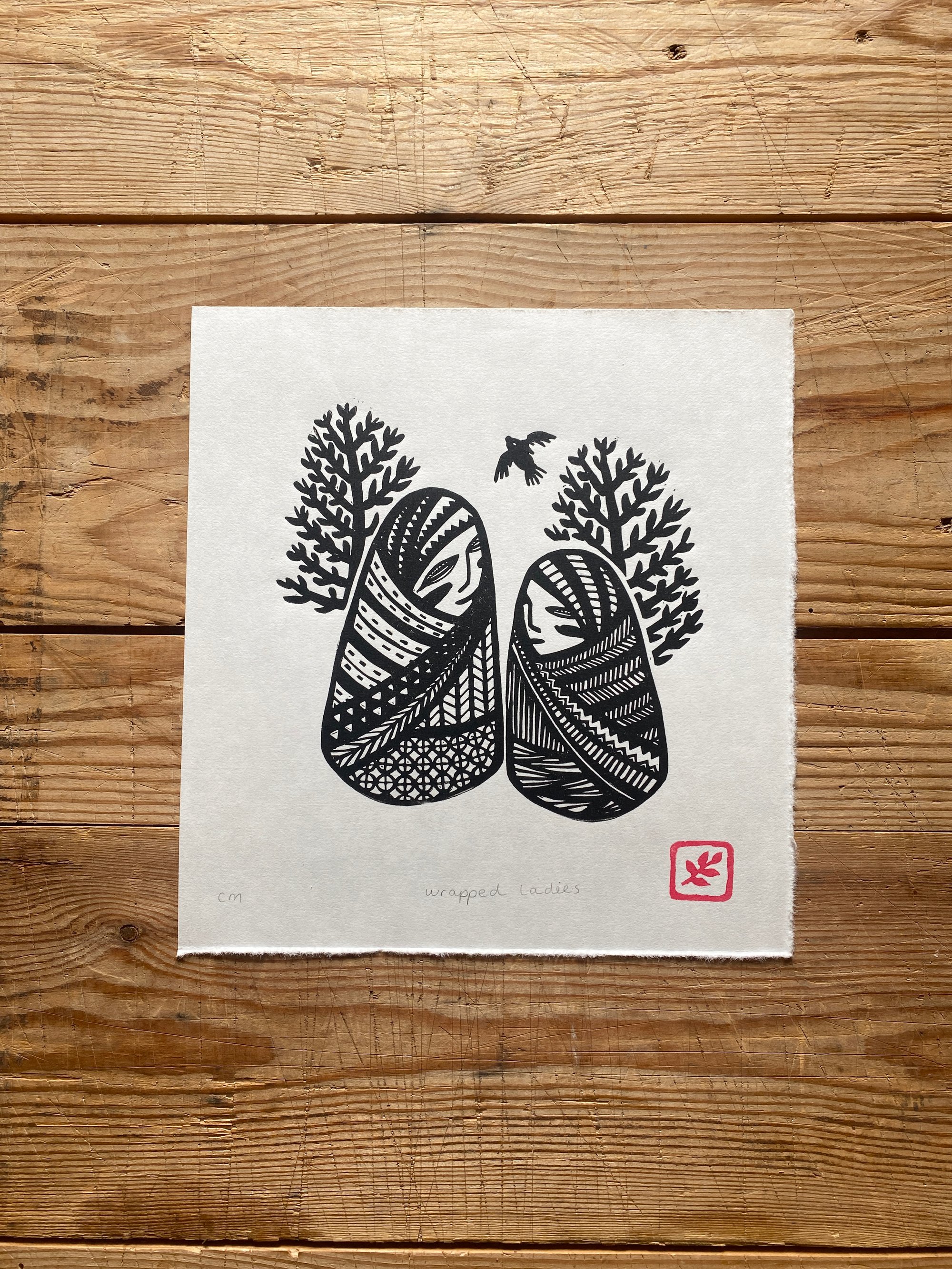 Original lino print, hand printed on traditional Japanese HoSho paper of a 2 wrapped ladies.